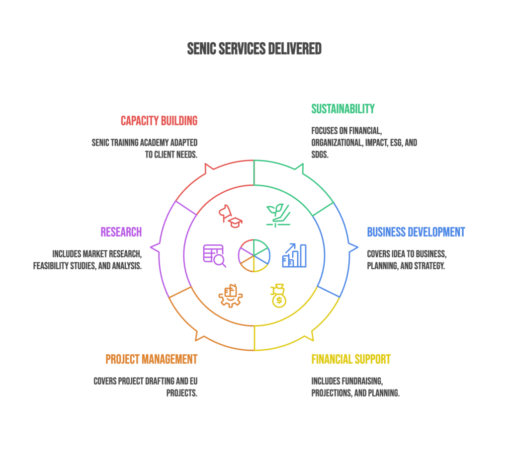 In 2025, SENIC (Sustainable Entrepreneurship and Innovation Center) strengthened its position as a Brussels-based, EU-wide consultancy bridging academic rigor with real-world execution. We supported organisations to embed sustainability into core operations, translate impact goals into measurable results, and build long-term capability through consulting, research, project development, and training.