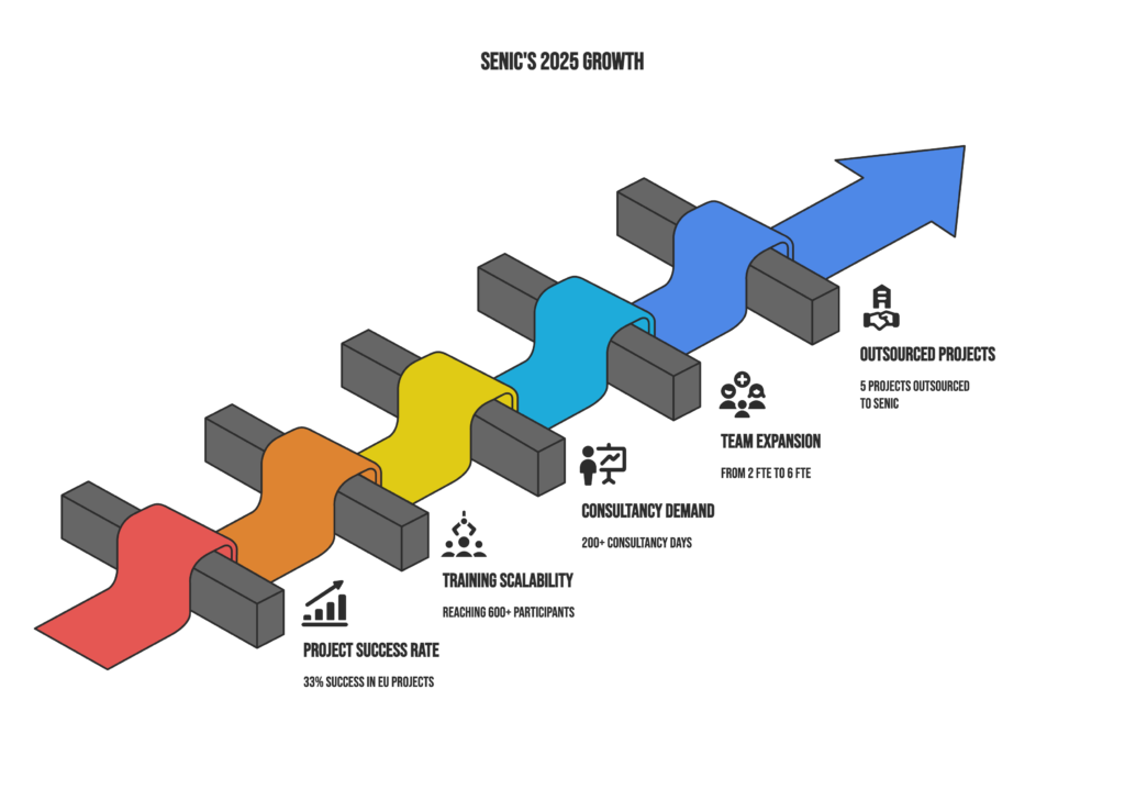 2025 marked the first year of delivery against SENIC’s 2025–2030 strategy: putting sustainable entrepreneurship at the forefront and helping entrepreneurs and organisations integrate societal impact with economic growth (the triple bottom line). In practice, this meant expanding SENIC’s capacity (core team growth from 2 to 6 FTE), delivering evidence-based consulting and research-driven support (200+ consultancy days), and scaling knowledge transfer through 10 training programmes reaching 600+ participants. We also strengthened our EU collaboration capability through an approved Erasmus+ project (European Commission validation), while investing in technology—StrategizePlus and ImpactLab—to build a more scalable, efficient platform for made-to-measure support.